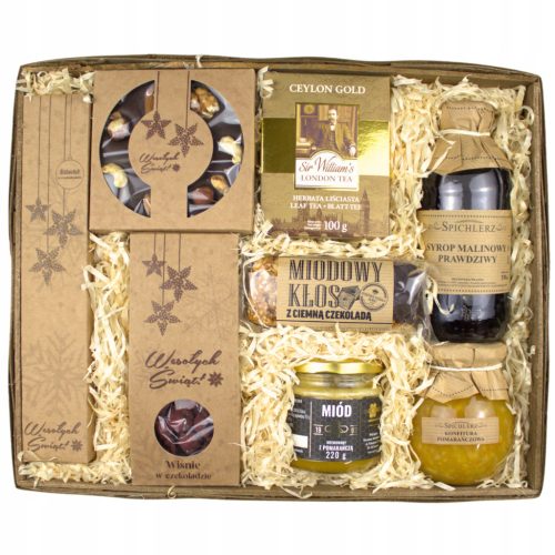 Świąteczny duży kosz prezentowy pełen luksusowych słodyczy i naturalnych przetworów – idealny wybór na wyjątkowy prezent. W zestawie znajdziesz ekskluzywne śliwki w belgijskiej czekoladzie od Alta Saska, wiśnie otulone czekoladą, tradycyjny kołacz słowiański z orzechami oraz wysokogatunkową herbatę cejlońską, doskonałą na zimowe poranki. Zestaw zawiera również polski miód kremowany z dodatkiem pomarańczy, naturalną konfiturę pomarańczową, syrop malinowy oraz baton słodzony miodem i oblewany czekoladą – idealne dopełnienie świątecznych chwil przy kominku. Wyjątkowy upominek dla każdego, kto ceni smak tradycyjnych, wysokiej jakości produktów.