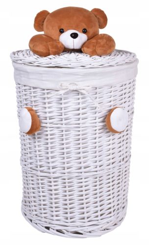 Kosz wiklinowy idealnie sprawdzi się w łazience do przechowywania prania. Jest on bardzo ładnym uzupełnieniem, które dodaje charakteru dekorowanym pomieszczeniom. Produkt wykonany z wikliny równym splotem, w środku wykończony wytrzymałą, kremową, lnianą wyściółką. Pokrywa posiada na górze przyjemnego w dotyku, pluszowego misia.