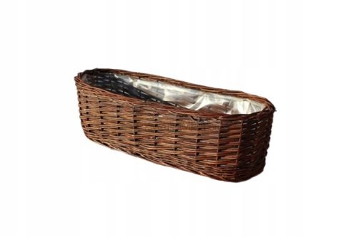 Doniczka z wikliny w kształcie owalnym. Idealnie komponuje się w ogrodzie z innymi doniczkami. Jej naturalnym wygląd wspaniale prezentuje się na parapecie. Dokładność wyplatania i wysoka jakość materiału zapewnia trwałość doniczki przez wiele sezonów. Każda doniczka jest obszyta grubą folią.