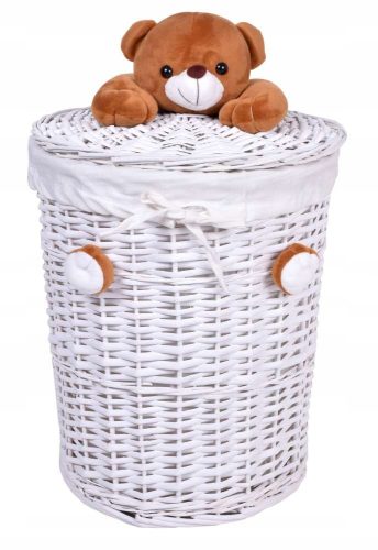 Kosz wiklinowy idealnie sprawdzi się w łazience do przechowywania prania. Jest on bardzo ładnym uzupełnieniem, które dodaje charakteru dekorowanym pomieszczeniom. Produkt wykonany z wikliny równym splotem, w środku wykończony wytrzymałą, kremową, lnianą wyściółką. Pokrywa posiada na górze przyjemnego w dotyku, pluszowego misia.