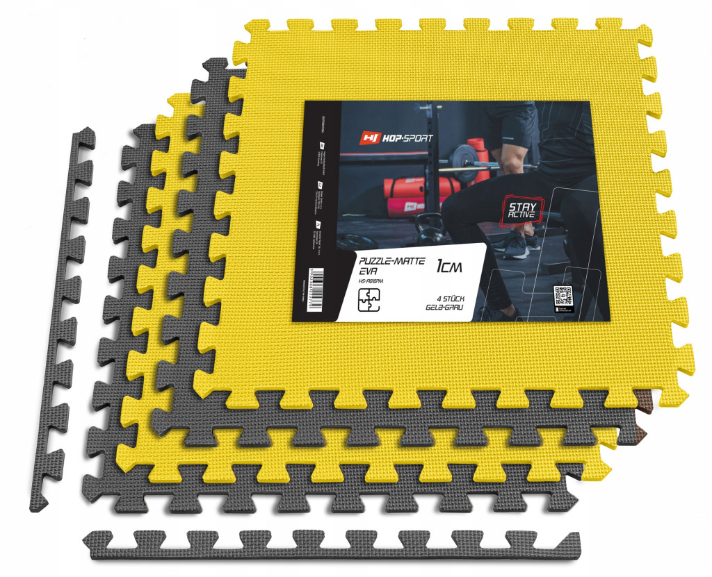Mata puzzle EVA 1 cm 4 sztuki szaro/żółte HS-A010PM zapewni Ci idealną ochronę podłoża podczas domowych treningów. Mata puzzle, wykonana z antypoślizgowej pianki EVA skutecznie sprawdzi się jako podkład amortyzujący pod sprzęt i urządzenia typu: rowery stacjonarne, orbitreki, wioślarze, bieżnie czy ławeczki. Ponadto, matę puzzle możesz wykorzystać do ćwiczeń siłowych – dzięki niej treningi ze sztangą lub z odważnikami kettlebells będą dużo bardziej bezpieczne i komfortowe. Model HS-A010PM składa się z 4 płytek wraz z obrzeżami. Po rozłożeniu wymiary maty wynoszą 120 x 120 cm.