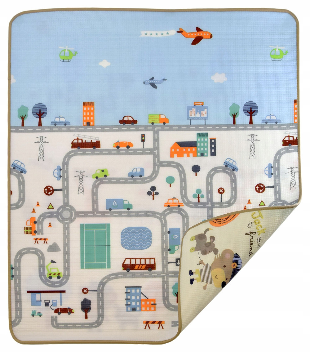 Na jej pierwszej stronie znajduje się grafika przedstawiającą miasto z uliczkami: znajdziemy tu pojazdy, takie jak auta osobowe, helikoptery, samoloty, ciężarówki czy straż pożarną, a także budynki i znaki drogowe. Po drogach mogą jeździć autka, co jest kreatywną i wspaniałą formą zabawy zarówno dla chłopców, jak i dziewczynek.