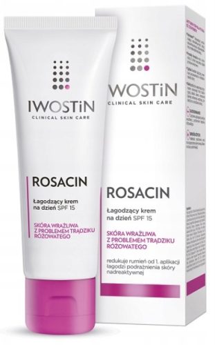 Iwostin Rosacin Łagodzący Krem na Dzień SPF 15 zmniejsza widoczność rumienia, maskuje zaczerwienienia skóry, a także przynosi ulgę i przywraca komfort. Dedykowany jest skórze wrażliwej i z problemem trądziku różowatego.