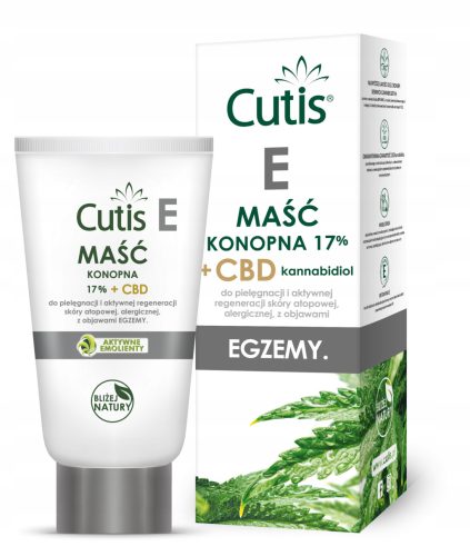 CUTIS CBD E - EGZEMA maść konopna 120 ml zawierająca 17% oleju konopnego to aktywny emolient na bazie oleju konopnego o unikalnej formule, wzbogaconej gwarantowaną zawartością CBD - kannabidiolu, substancji aktywnej o silnych właściwościach przeciwzapalnych, przeciwbólowych, przeciwalergicznych i antybakteryjnych. Bogata formuła preparatu, oparta na wyselekcjonowanych i skutecznych substancjach, działa zarówno na powierzchni skóry, jak i w jej głębokich warstwach, dzięki czemu redukuje objawy wielu dermatoz, takich jak m.in.: egzema, atopowe zapalenie skóry (AZS) czy alergie.