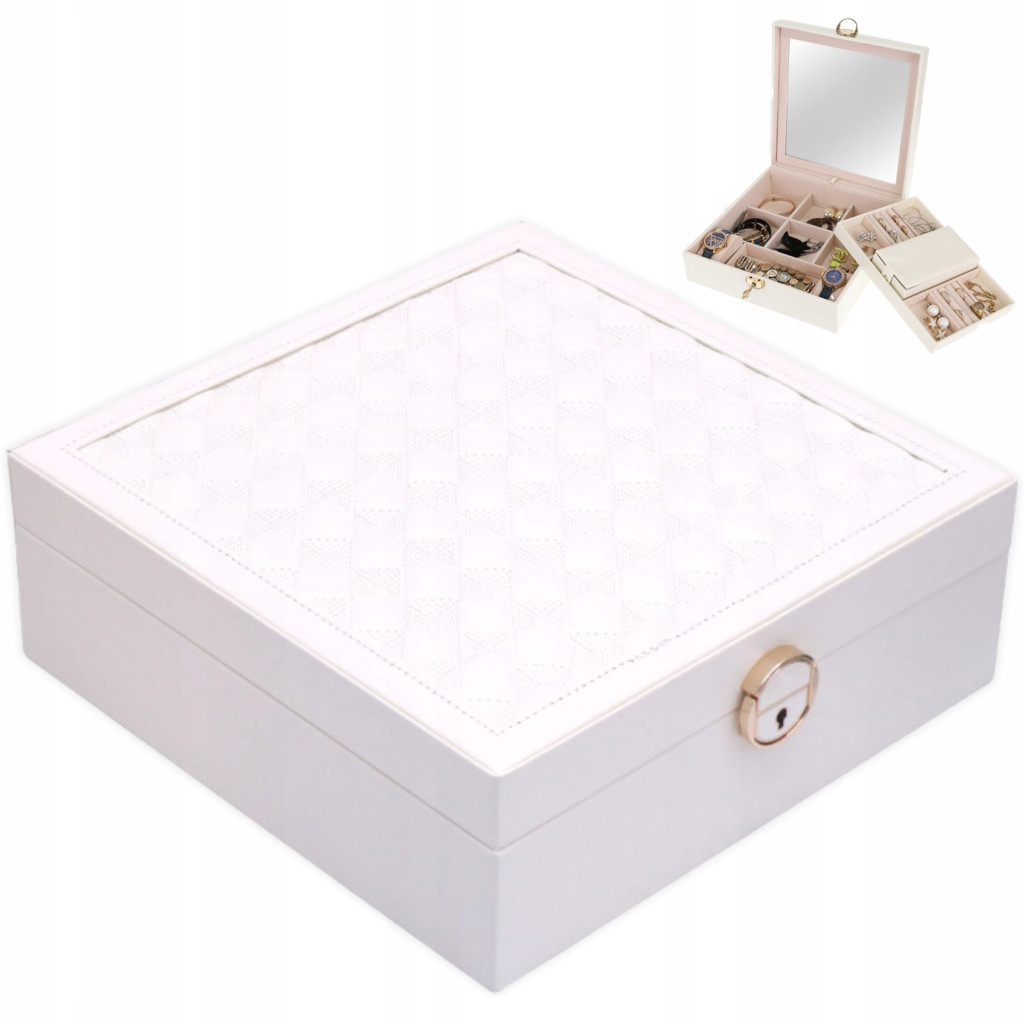 Wewnątrz kuferka znajduje się uchylne lusterko, które ułatwia zakładanie biżuterii oraz wykonanie szybkiego makijażu. Pod lusterkiem znajduje się dodatkowy schowek, idealny do przechowywania najcenniejszych i najbardziej delikatnych ozdób.