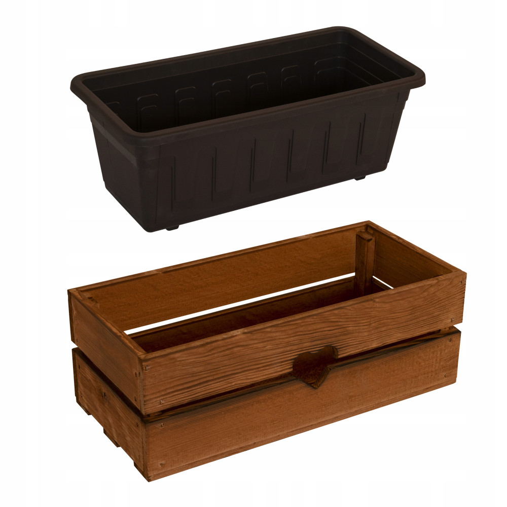 Wewnątrz znajduje się plastikowa doniczka idealnie pasująca do skrzynki.