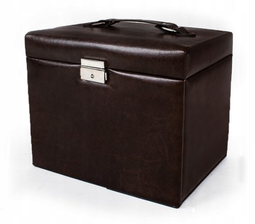 Brązowy kuferek na biżuterię wykonany jest z brązowej skóry ekologicznej.