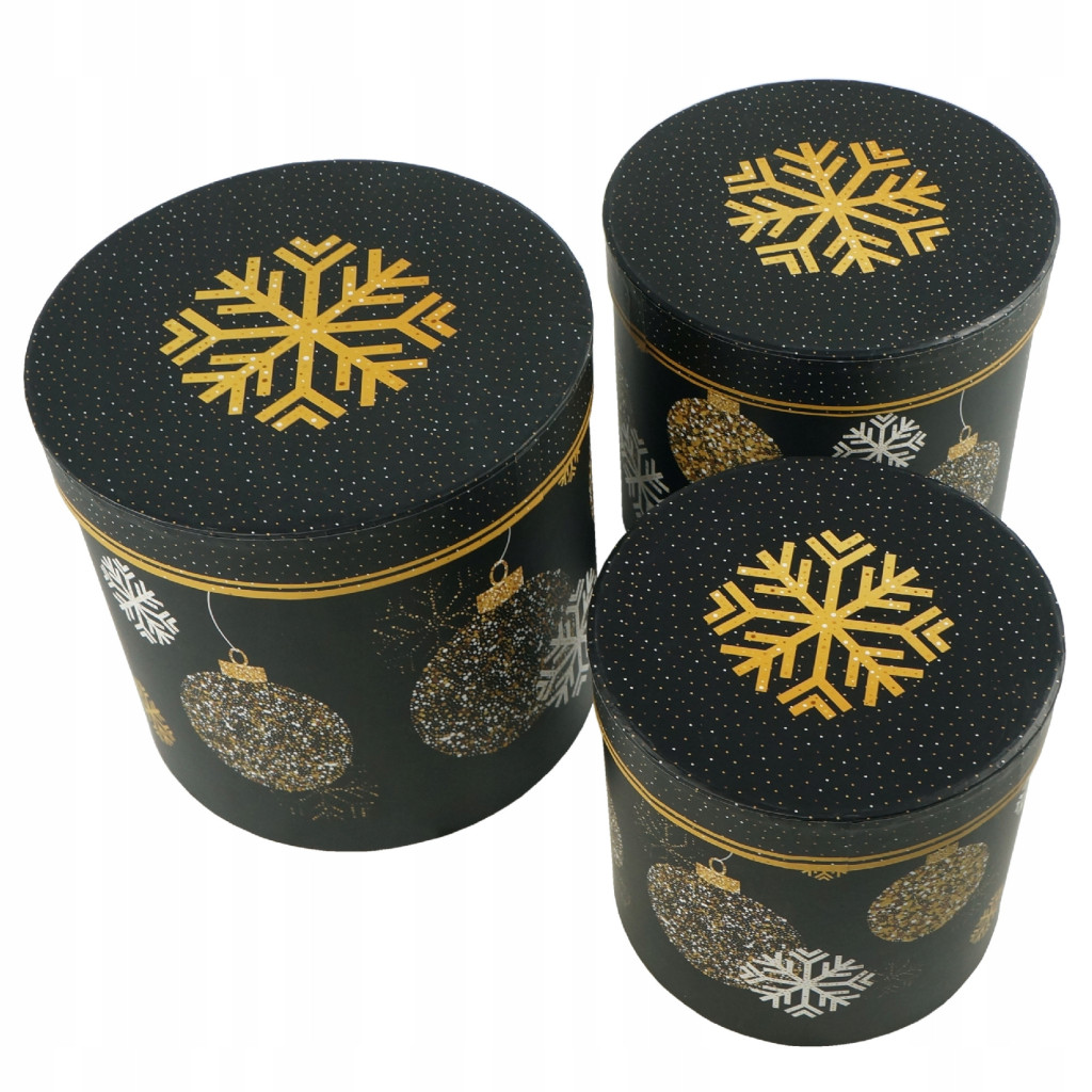 Komplet okrągłych flowerboxów ze stylowymi świątecznymi nadrukami. Doskonały jako oprawa dla ozdób świątecznych i prezentów na święta.
