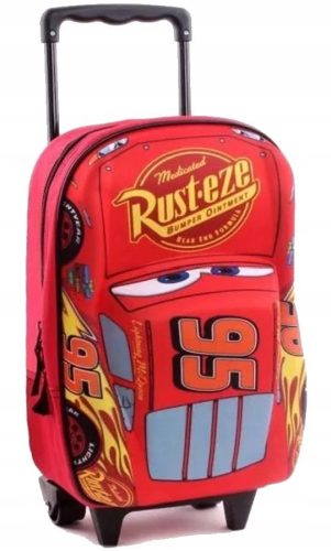 Walizka podróżna na kółkach dla chłopca - trolley - Auta - Cars. Ta walizka dziecięca ma jedną główną komorę o wymiarach 34 x 23 x 12 cm z zamkiem błyskawicznym. Przednia strona walizki to 3D w kształcie błyskawicy McQueen. Ponadto jest wyposażony w wysuwany uchwyt z plastikowym uchwytem (wysokość po pełnym wysunięciu około 57 cm), kółka i przednie nóżki, tekstylne ucho do zawieszenia oraz regulowane wyściełane paski do przenoszenia na plecach.