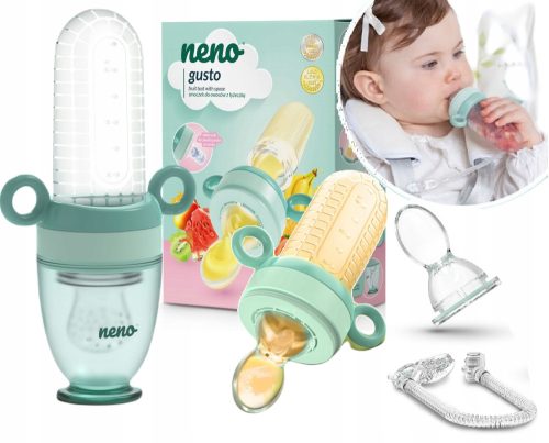 Neno Gusto to akcesorium, które jest przydatne przy rozszerzaniu diety. Praktyczny smoczek został wykonany z wysokiej jakości tworzywa, które nie zawiera szkodliwego bisfenolu A. Sprawdza się do podawania owoców i warzyw, a dołączona do niego łyżeczka ułatwia dziecku spożywanie musów i przecierów podczas nauki samodzielnego jedzenia.