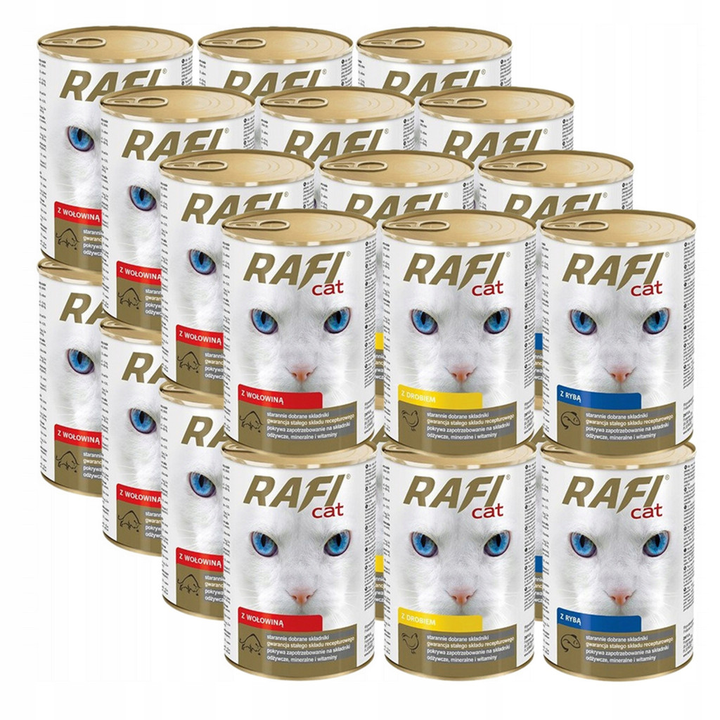 Karmy Rafi Cat to pełnoporcjowe karmy dla dorosłych kotów, które posiadają odpowiednio skomponowany skład spełniający ich wszystkie specyficzne wymagania żywieniowe. Najważniejszymi ich walorami są podstawowe surowce: mięso i produkty pochodzenia zwierzęcego oraz ryby i produkty rybne, które są źródłem wysokiej jakości białka. Karmy są produktami o optymalnej zawartości tłuszczu będącego źródłem naturalnie występującego w mięsie i produktach pochodzenia zwierzęcego kwasu arachidonowego – niezbędnego do prawidłowego funkcjonowania organizmu kotów. Dodatkowo surowce mięsne są naturalnymi źródłami kwasów z rodziny n-6, a dodatek do karm tauryny pokrywa fizjologiczną normę, dzięki czemu proces trawienia tłuszczu i białek zachodzi w sposób prawidłowy. Odpowiedni stosunek wapnia do fosforu przyczynia się do utrzymania prawidłowej homeostazy tych pierwiastków w organizmie i zachowania mineralizacji kości na stałym poziomie.