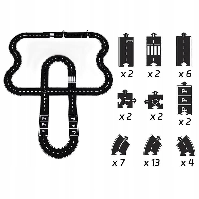 - ilość elementów - 40 szt: 12 szt odcinków prostych (min 2 szt przejście dla pieszych, 2 szt parking), 24 szt łuków (zakrętów), 2 szt skrzyżowanie, 2 szt rondo