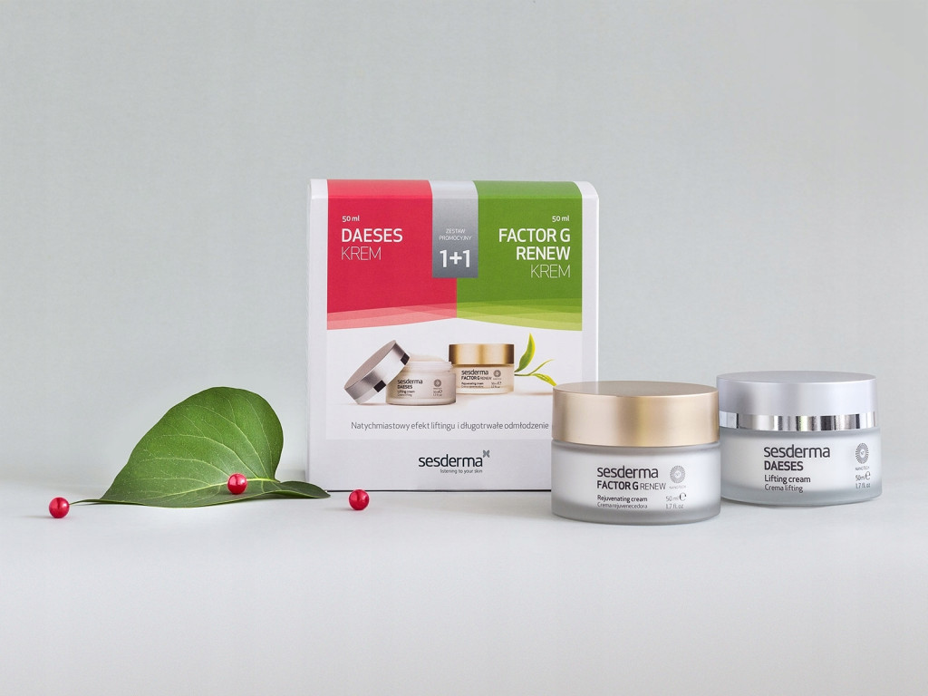 DAESES to intensywnie wygładzający krem na dzień o natychmiastowym działaniu liftingującym. Zwiększa elastyczność skóry, dając efekt jej ujędrniania. Głównym składnikiem kremu jest DMAE, który stymuluje fibroblasty do produkcji kolagenu i elastyny, głęboko odżywiając skórę. Pozwala to w mgnieniu oka uzyskać efekt wygładzonych zmarszczek oraz liftingu, co doskonale uzupełnia długotrwałe działanie odmładzające kremu FACTOR G RENEW.