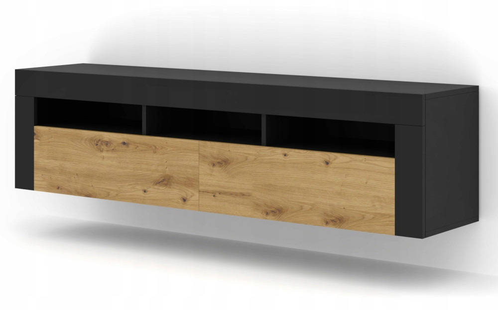Szafka RTV MORENO to uniwersalny mebel, który umożliwia powieszenie na ścianie lub ustawienie na podłodze. Najodpowiedniejszą dla siebie wersję można wybrać w trakcie montażu. Głównymi cechami szafki są funkcjonalność, efektowny wygląd oraz modernistyczna stylistyka. Geometryczna bryła sprawia, że całość prezentuje się nowocześnie, co dodatkowo podkreśla modna kolorystyka. Trzy otwarte półki można wykorzystać do ustawienia konsoli do gier, dekodera, pilotów, książek lub innych drobiazgów, a zamykane schowki posłużą jako dodatkowe miejsce do przechowywania.
