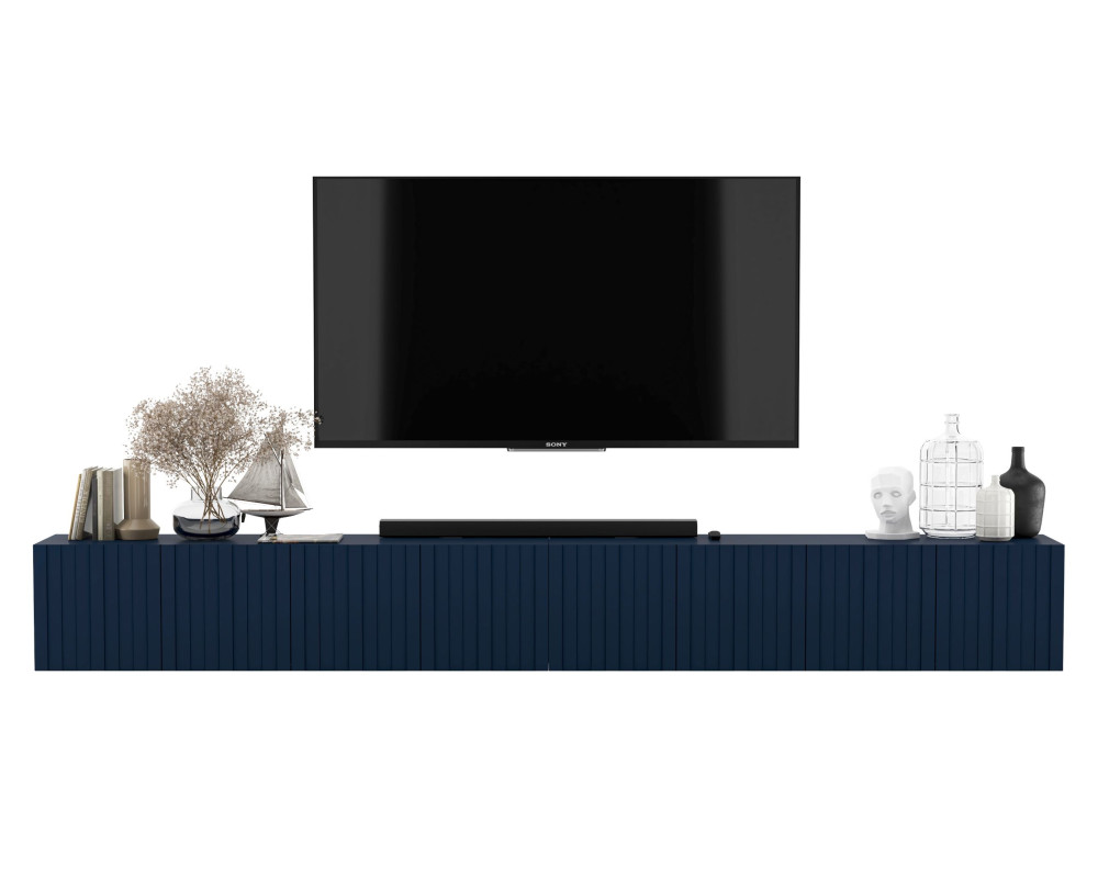 Dwie wiszące szafki RTV w stylu Glamour z kolekcji ELPIS, idealnie nadają się pod telewizor oraz dodadzą każdemu wnętrzu niepowtarzalnej elegancji. Umieszczone obok siebie tworzą jeden długi, bardzo ładnie prezentujący się mebel. Posiadają cztery funkcjonalne, zamykane komory z podziałem na dwa poziomy. System "push to open" do otwierania drzwiczek zapewnia estetyczny wygląd szafki, ze względu na brak widocznych uchwytów. Występuje również możliwość regulacji wysokości półek, która pozwala na dostosowanie przestrzeni do indywidualnych potrzeb. Meble z tej kolekcji wyróżniają się na tle innych szafek RTV ryflowanymi frontami, które podkreślają nowoczesny i elegancki wygląd szafek.