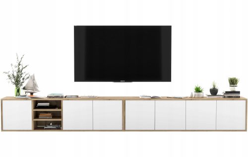 Dwie wiszące szafki RTV w stylu Loft z kolekcji APOLLO, idealnie nadają się pod telewizor oraz pasują do każdego wnętrza. Umieszczone obok siebie tworzą jeden długi, bardzo ładnie prezentujący się mebel. Posiadają cztery zamykane komory z podziałem na dwa poziomy i jedną komorę otwartą- trzypoziomową. Wygodny system "push to open" do otwierania drzwiczek.
