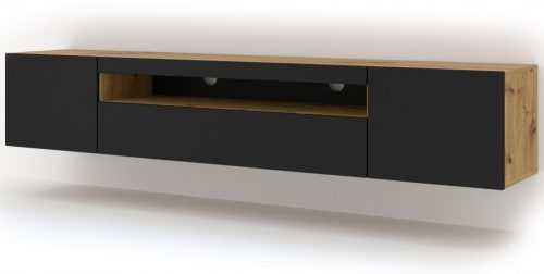 Uniwersalna szafka pod telewizor, idealna do salonu lub pokoju młodzieżowego. Szafka jest uniwersalna - można ją powiesić na ścianie lub postawić (posiada cokoły, które można opcjonalnie zamontować). Szafka jest wykonana w nowoczesnym stylu Posiada jedną otwartą półkę (miejsca przeznaczone na dekodery lub konsole) oraz trzy zamykane schowki (dwa otwierane na boki i jeden do dołu)