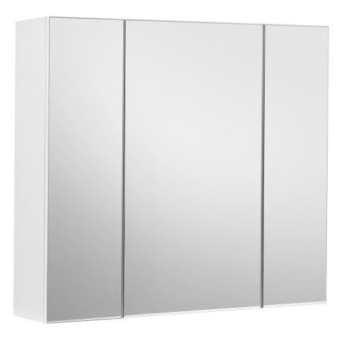 Szafka łazienkowa z lustrem i trzema drzwiami, które subtelnie otwierają się, ujawniają przestrzeń zaprojektowaną z myślą o organizacji i wygodzie użytkowania. Wnętrze szafki jest wyposażone w trzy poziomy półek, z których dwie znajdują się w lewej komorze, a jedna w prawej, co zapewnia odpowiednią przestrzeń na przechowywanie różnorodnych akcesoriów łazienkowych. Kluczową cechą tej szafki jest możliwość regulacji półek w trzech stopniach, co pozwala dostosować wnętrze do indywidualnych potrzeb i preferencji. Szafka posiada lakierowaną powierzchnię, która nadaje jej elegancji oraz ułatwia czyszczenie nawet zwykłą suchą szmatką. Idealnie komponuje się z innymi elementami wyposażenia łazienki, tworząc spójną i harmonijną przestrzeń, ale również może stanowić centralny punkt łazienki, który doda jej charakteru i eleganckiego stylu, utrzymując porządek dla różnorodnych akcesoriów.