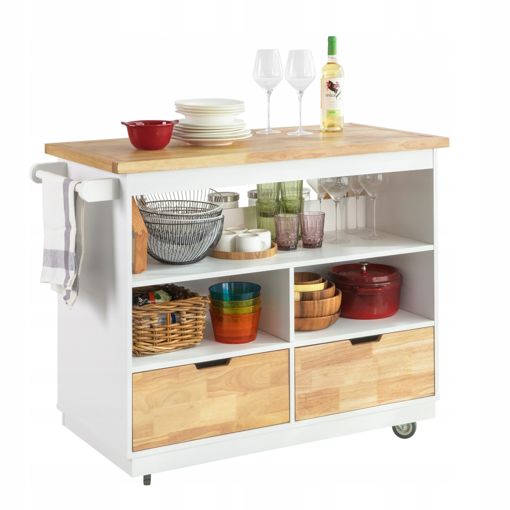 Ten praktyczny wózek kuchenny wyposażony jest w zamkniętą szufladę, wyjmowany kosz, półkę na trzy butelki oraz otwartą półkę boczną, na której można przechowywać wiele przyborów kuchennych.