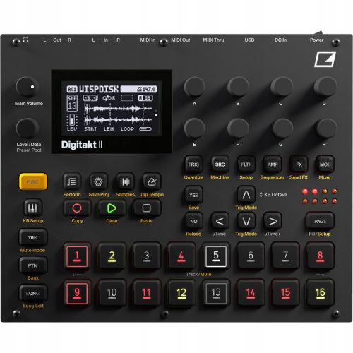 Elektron Digitakt II - kompaktowa cyfrowa maszyna perkusyjna do próbkowania z 16 ścieżkami audio i MIDI w stereo lub mono, 5 wybieralnymi maszynami audio, 5 maszynami filtrów, sekwencerem o 128 krokach na wzorzec lub ścieżkę, wielomodalnym filtrem, integracją z komputerem, delayem, pogłosem i chorus.Z Digitakt II możesz próbkować dźwięk w stereo, aby tworzyć złożone aranżacje rytmiczne. Twórz bity na 16 ścieżkach, gotowych do stereo i mono próbek lub MIDI. Wybieraj spośród kilku filtrów dla każdej ścieżki i korzystaj z szerokiej gamy efektów i modulacji. Generator sekwencji euklidesowych, rozbudowany 128-krokowy sekwencer, zbieranie próbek, tryby triggery, obszerna biblioteka próbek i praca w modularnej konstrukcji zapewniają ogromne możliwości w tworzeniu rytmów.