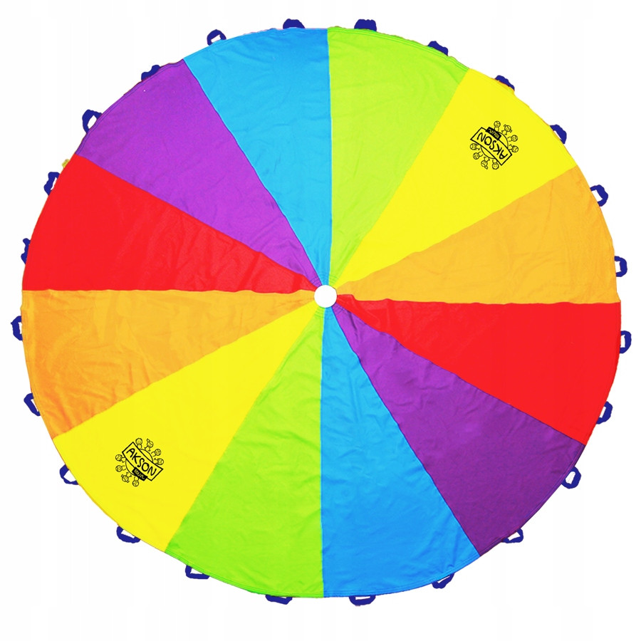 falowanie, przebieganie pod, wrzucanie piłeczki do środka, podrzucanie kolorowych piłeczek, balonów itp. Spadochron w praktycznym, kolorowym futerale. Kolorystyka: tęcza