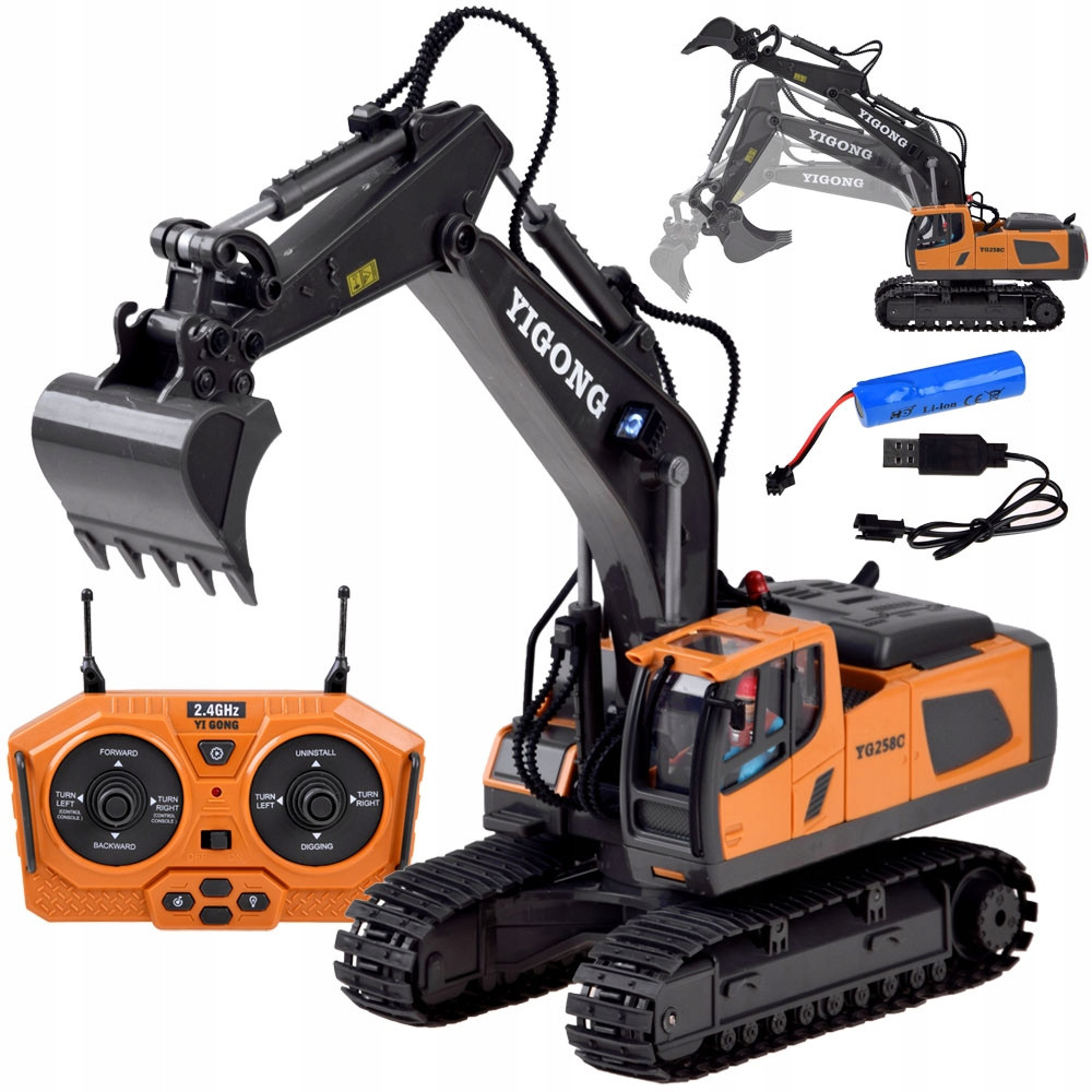 Zabawka wykonana z plastiku z ruchomą łyżką oraz z gumowymi gąsienicami. Zabawka wzbogacona w efekty dźwiękowe: praca silnika, efekt świetlny. Pilot odpowiada za prace łyżki góra, dół. Koparka jeździ do przodu do tyłu skręca w prawo, lewo. Zabawa taką zabawką pozwoli każdemu małemu dziecku na wyśmienitą zabawę.
