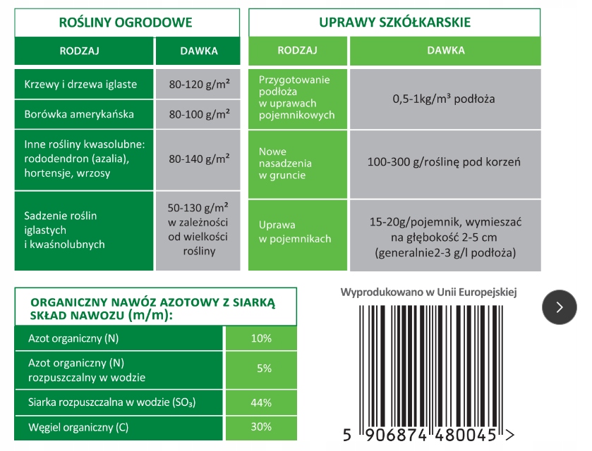 Nawóz doglebowy do iglaków BiOgardena jest przeznaczony do iglaków preferujących niskie pH gleby, np. tui, świerków, jałowców, jodły, choiny, cyprysików, modrzewi, sosen. Dostarcza roślinom azot organiczny i siarkę elementarną.