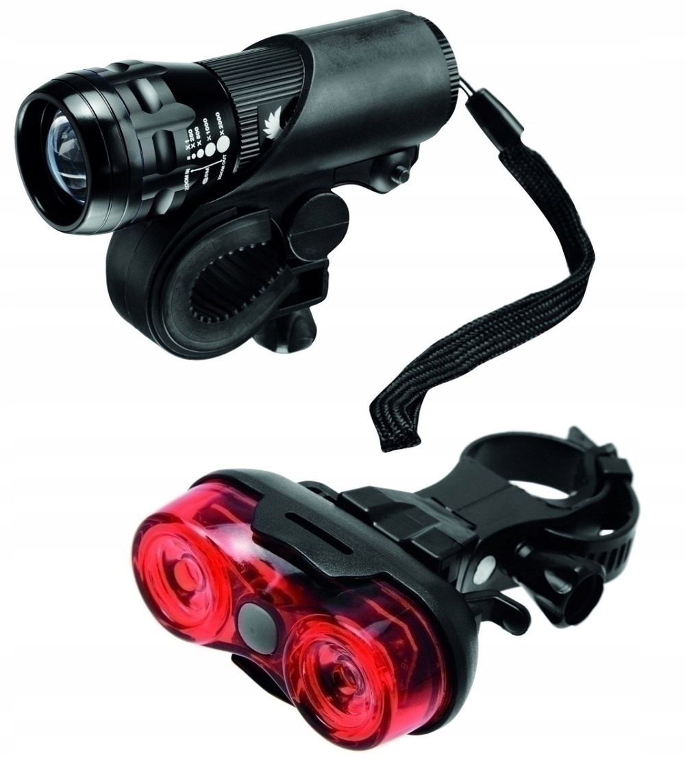 Zestaw lekkich bateryjnych lamp rowerowych.