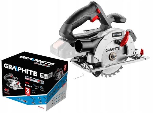 Pilarka tarczowa GRAPHITE, współpracująca z akumulatorami 18V Li-Ion GRAPHITE Energy+. Pilarka posiada możliwość cięcia pod kątem w zakresie od 0° do 45°. Maksymalna grubość ciętego materiału wynosi do 48 mm. Regulacja kąta oraz głębokości cięcia odbywa się bez użycia narzędzi. Pilarka współpracuje z tarczami tnącymi o średnicy zewnętrznej 150 mm i średnicy otworu 10 mm. Prędkość obrotowa tarczy na biegu jałowym wynosi 4200 obr./min. Pilarka została wyposażona w uchwyt z blokadą chroniącą przed przypadkowym włączeniem, pokryty antypoślizgowym tworzywem, dzięki czemu praca jest wygodna i bezpieczna. Posiada przyłącze do odsysania pyłu oraz wskaźnik laserowy. Stopa oraz górna osłona tarczy wykonane zostały z trwałego stopu aluminium. W zestawie z pilarką znajduje się prowadnica równoległa oraz klucz sześciokątny.