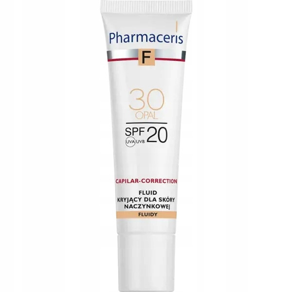 Pharmaceris F Fluid kryjący dla skóry naczynkowej SPF20 30 opal to kosmetyk, który został stworzony z myślą o skórze naczynkowej i nadreaktywnej, która wymaga wyrównania kolorytu i ukrycia niedoskonałości w postaci pajączków, rozszerzonych naczynek, nierówności struktury skóry, trądziku różowatego, nadmiernej skłonności do zaczerwienień, trwałego, napadowego i emocjonalnego rumienia, cieni wokół oczu czy obrzęków. Rekomendowany jest również do stosowania w celu wzmocnienia naczyń krwionośnych i redukcji tendencji do nasilania się zmian rumieniowych i podrażnień.
