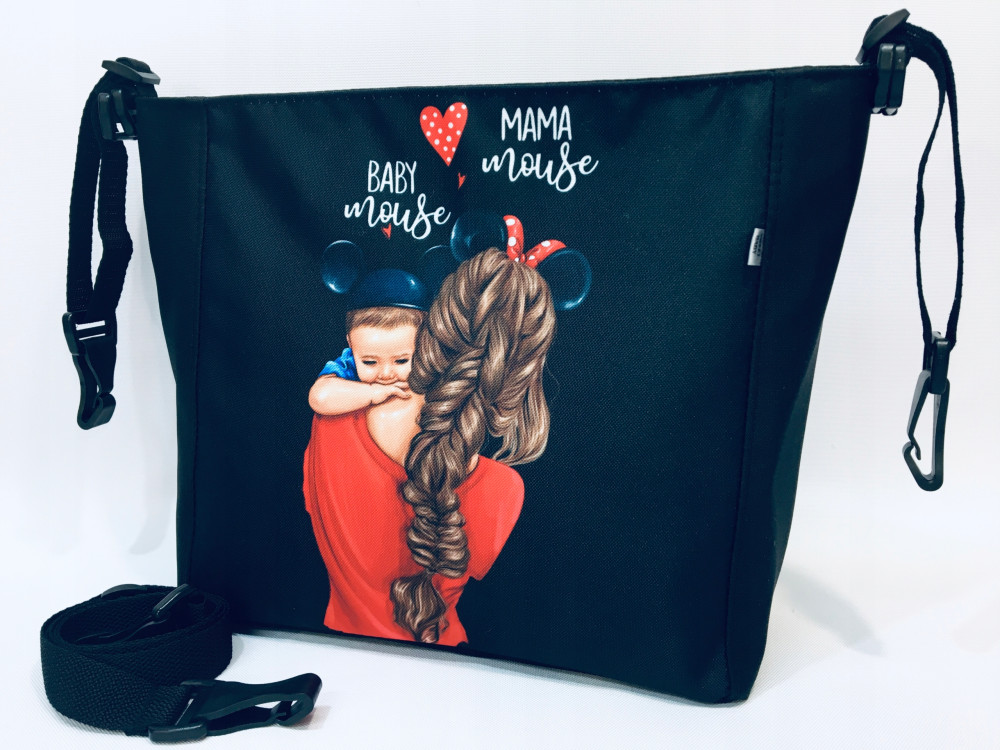 *torba posiada 2 zaczepy na wózek doszyte na stałe oraz długi dopinany pasek z regulatorem długości