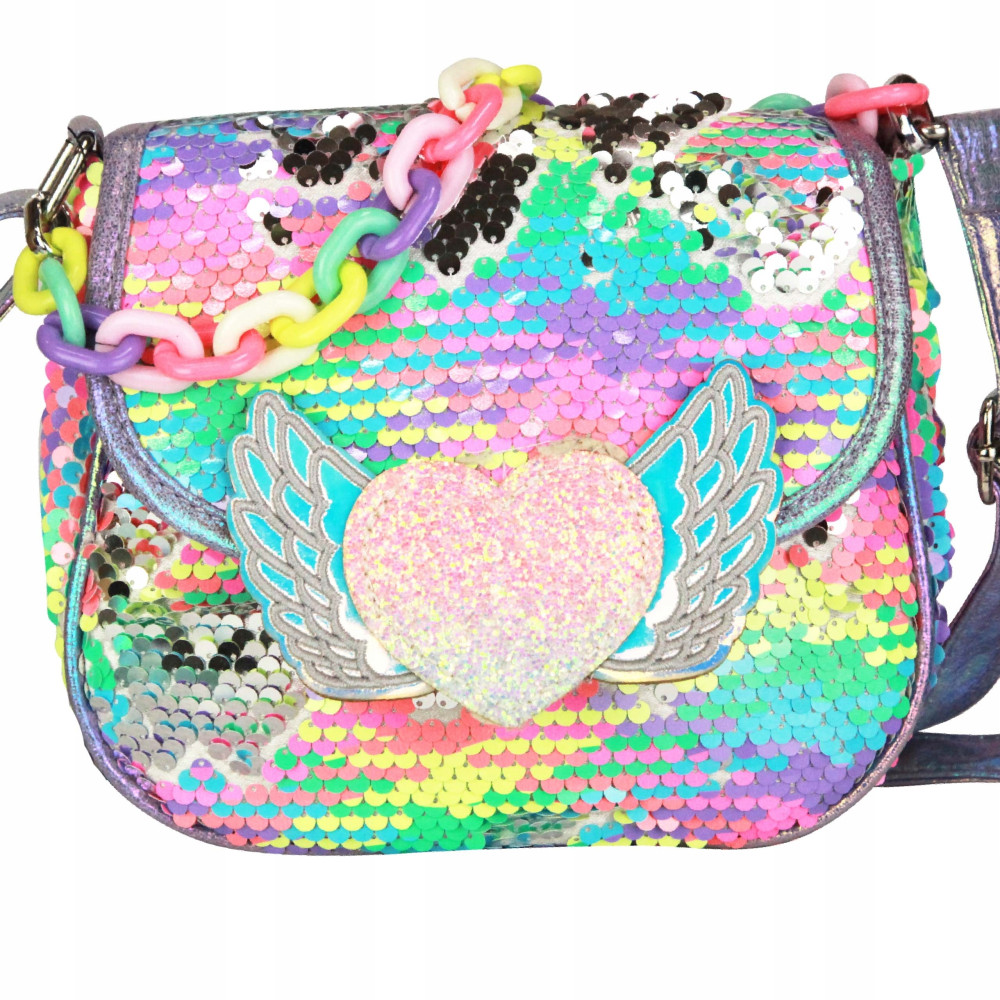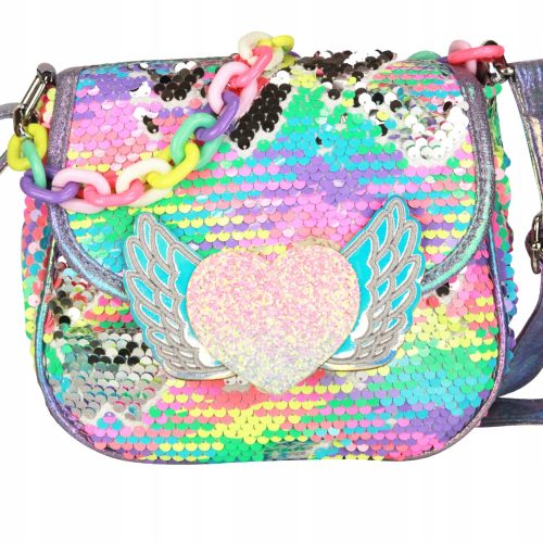 Zaskakujące magiczce cekiny z kolorowych po przełożeniu zmieniają się w kolor srebrny. Przy klapce torebki znajduje się brokatowe serduszko z fantastyczny holo skrzydełkami, które dodają uroku torebce. Dodatkowo przy torebce jest doczepiony kolorowy łańcuszek.