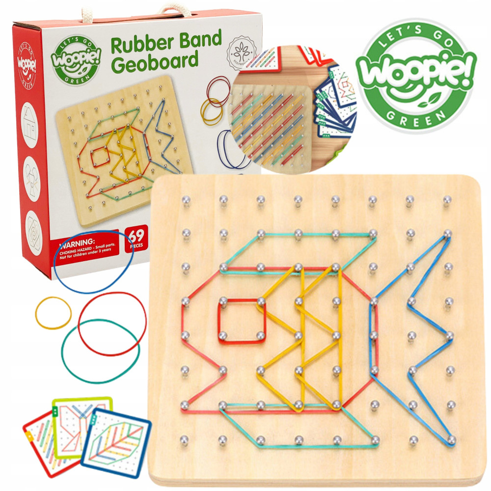 Drewniana Układanka Geoplan od marki WOOPIE z serii GREEN to edukacyjna gra kreatywności i wyobraźni. Zestaw składa się z 48 elastycznych gumek oraz z 20 dwustronnych kart z 40 wzorami o różnym stopniu trudności (3 poziomy). W tej grze dzieci starają się odtworzyć obraz z karty za pomocą gumek - tworząc kontury różnych kształtów np. rybki. Zabawę można urozmaicić o grę w zapamiętywanie i odtwarzanie z pamięci obrazka przez malucha. Dziecko może również wymyślić swój własny kształt/kontr - ogranicza tylko kreatywność i wyobraźnia. Zabawka rozwija zdolności manualne, logiczne myślenie, wyobraźnie i kreatywność, koncentracje oraz zapamiętywanie.