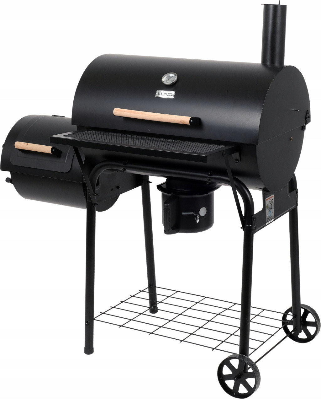 Grill ogrodowy XXL marki LUND do przygotowywania potraw na świeżym powietrzu, łączący funkcje grilla i wędzarni.