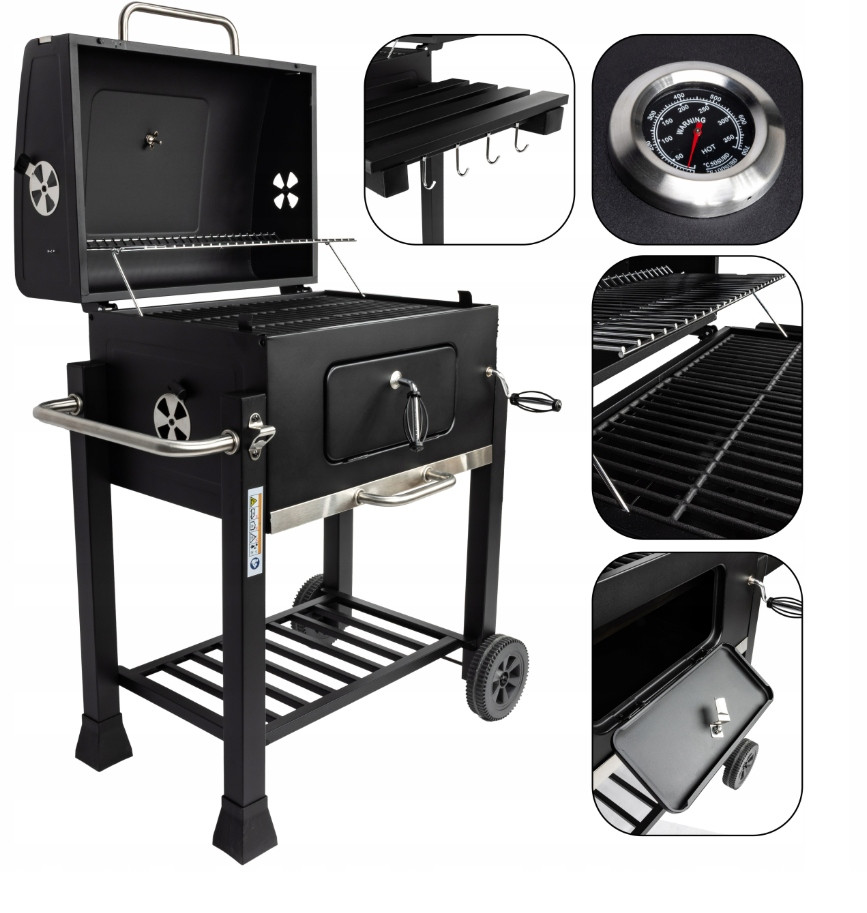 Grill ogrodowy Velio HESTIA marki Rino to wytrzymałe i funkcjonalne urządzenie przeznaczone dla każdego miłośnika grillowania. Wyposażony w system otworów wentylacyjnych pozwala na skuteczną regulację przepływu powietrza, co ułatwia osiągnięcie optymalnej temperatury grillowania. Termometr na pokrywie umożliwia precyzyjne śledzenie temperatury wewnętrznej, a boczny stolik z haczykami zapewnia wygodę podczas przygotowywania posiłków. Dzięki kółkom grill jest łatwy do przestawienia, co jest przydatne w zależności od miejsca użytkowania. Ruszt żeliwny, gwarantujący równomierne rozprowadzenie ciepła, pozwala na perfekcyjne przygotowanie zarówno mięs, jak i warzyw. Czarny, elegancki wygląd grilla świetnie wpisuje się w otoczenie ogrodu lub patio.