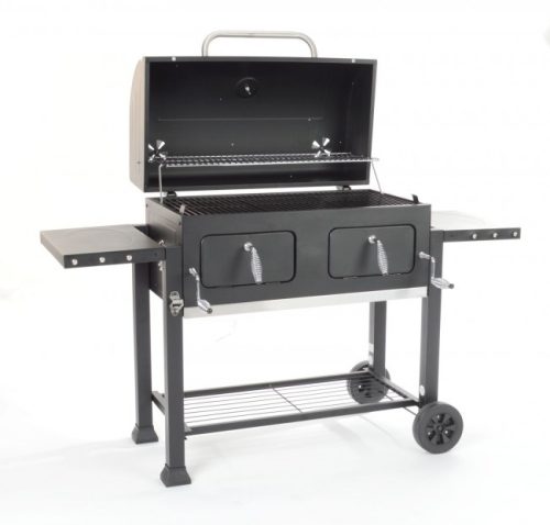 Wygodne półki: Składane półki boczne oraz dolna półka na akcesoria lub węgiel.