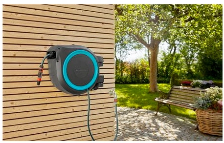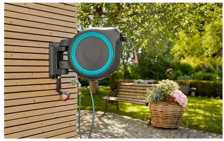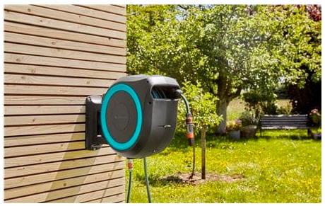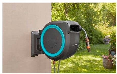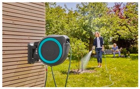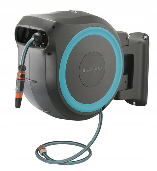 Dzięki bębnowi naściennemu, Twój wąż ogrodowy jest zawsze pod ręką. Do uchwytu umożliwiającego montaż naścienny można dołączyć, i w ten sposób przechowywać, pistolety, zraszacze i szczotki do mycia.