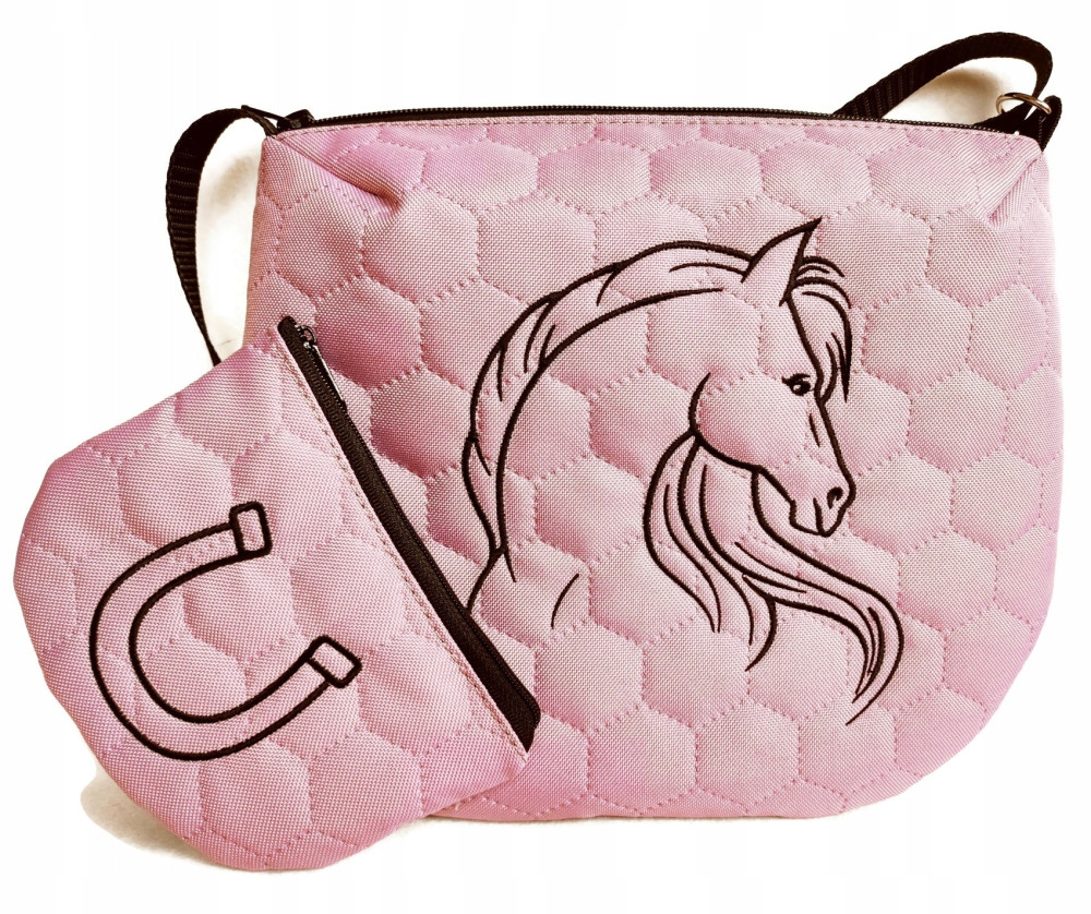 Torebka i portmonetka wykonane z pikowanego wodoodpornego materiału, zapinane na suwak, długość paska w torebce regulowana, bawełniana podszewka,