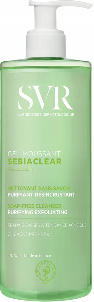SEBIACLEAR Gel Moussant marki SVR. Żel do twarzy, szyi, dekoltu i pleców. Skierowany jest do pielęgnacji skóry tłustej, mieszanej, wrażliwej i ze skłonnością do powstawania trądziku. W swoim składzie nie zawiera mydła, dzięki czemu nie wysusza. Dokładnie oczyszcza skórę z zanieczyszczeń, pozostałości kosmetyków oraz łoju. Zwalcza zaskórniki i odblokowuje pory, a przy tym delikatnie złuszcza martwy naskórek, bez podrażniania. Po zastosowaniu skóra jest idealnie oczyszczona, odświeżona oraz długotrwale matowa.