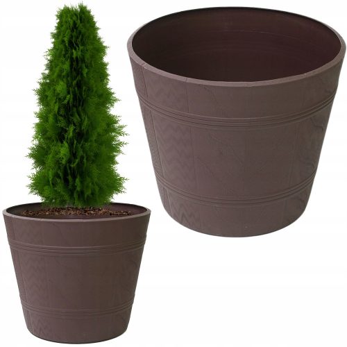 Wysoka, okrągła donica o powierzchni imitującej strukturę drewna, znakomicie uzupełnia aranżacje balkonu, przydomowego tarasu, werandy lub altany. Estetyczny wygląd i ładny kształt sprawia, że drewnopodobna doniczka również ładnie prezentuje się wewnątrz pomieszczeń.