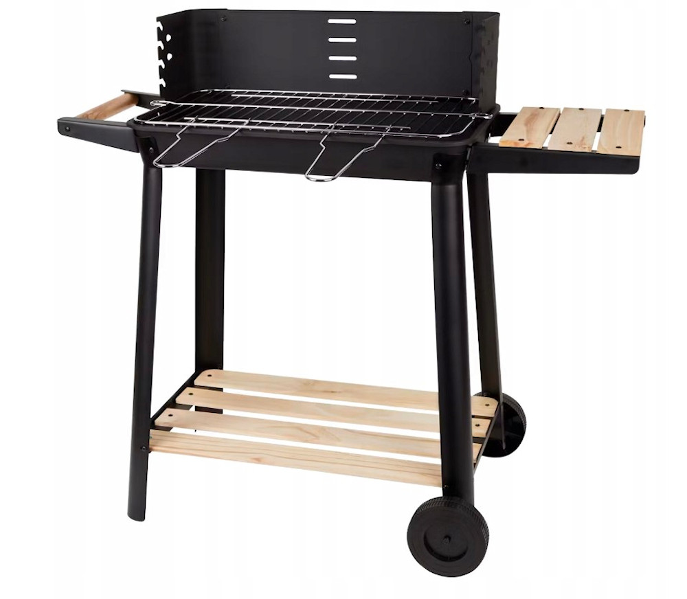 Prostokątny model grilla z drewnianymi tackami, z rusztem do pieczenia i schowkiem. Wbudowane koła umożliwiają łatwe i wygodne przenoszenie.
