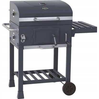 Otwory wentylacyjne pozwalają na regulację obiegu powietrza i zapobiegają wygaszeniu się węgla przy zamkniętej pokrywie. Klapa węglowa pozwala na dodanie opału w każdej chwili. Dzięki zintegrowanemu termometrowi w pokrywie możesz łatwo odczytać temperaturę w komorze pieczenia i regulować jej poziom. Poziom węgla w grillu jest regulowany za pomocą korby, dzięki czemu jedzenie jest zawsze przygotowane w odpowiedniej temperaturze. Posiada również żeliwny ruszt o powierzchni 58,0 cm x 42,5 cm, na którym przygotujesz potrawy dla kilku osób w tym samym czasie.