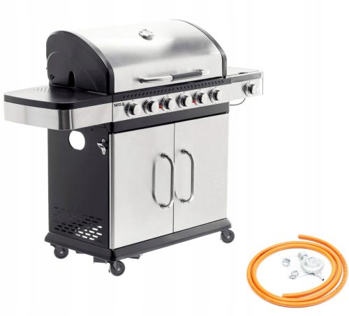 Nowocześnie wyglądający grill gazowy 6+1 wykonany ze stali nierdzewnej, wyposażony w niezawodny, żeliwny ruszt. Półki boczne oraz pojemna, zamykana szafka ułatwią przechowywanie przypraw i niezbędnych akcesoriów. Palnik boczny o mocy 2,2 kW umożliwi gotowanie i podgrzewanie potraw w garnku i na patelni.