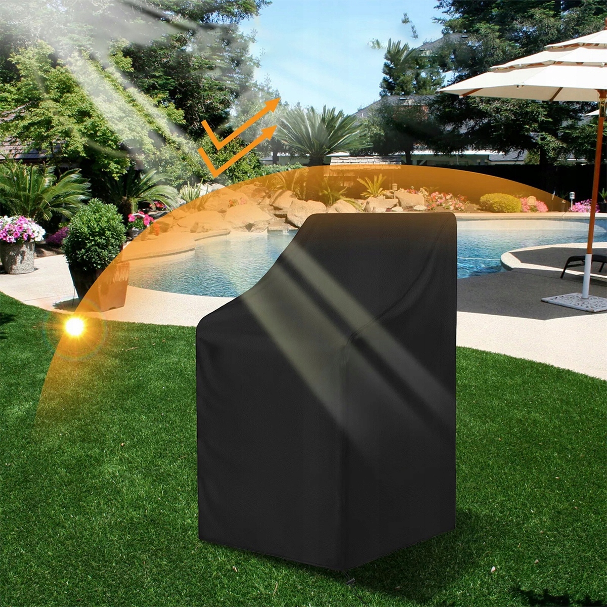 Wiatroodporny – Pokrowiec na krzesło ogrodowe posiada regulowany ściągacz, który zapewnia bezpieczne dopasowanie. Pokrowiec na krzesło ogrodowe nie zostanie zdmuchnięty przez wiatr.