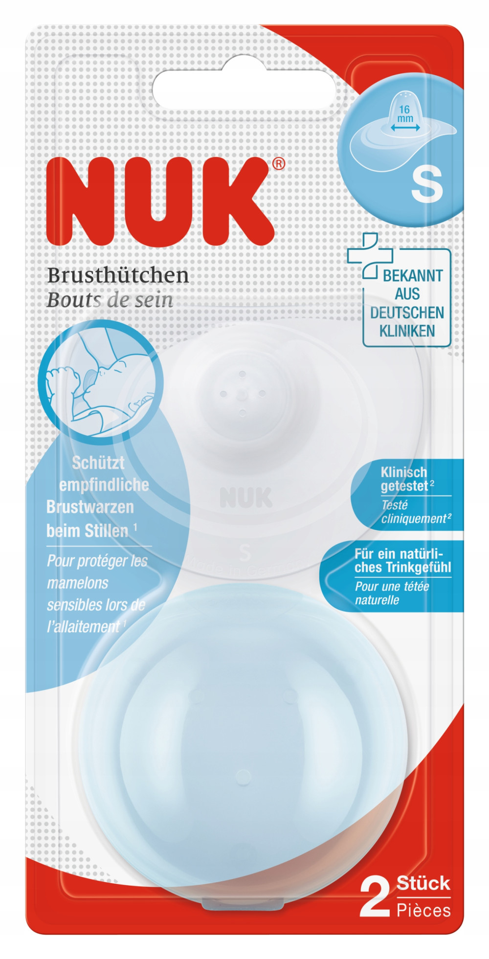 Wyjątkową zaletą osłonek brodawek sutkowych NUK jest ich optymalny kształt, który umożliwia możliwie najlepszy kontakt dziecka z piersią. 92% matek potwierdza, że nosek dziecka ma wystarczająco dużo miejsca podczas używania osłonek*. Niemowlę może czuć skórę i zapach mamy, dzięki czemu silna więź nawiązywana podczas karmienia nie jest zakłócona. Powierzchnia osłonki brodawek sutkowych NUK oraz cztery otwory , wzorowane na piersi mamy, sprawiają, że karmienie przy pomocy osłonki przypomina naturalne karmienie piersią. Wykonane z bardzo cieniutkiego silikonu osłonki chronią wrażliwe brodawki podczas karmienia, jak również pomagają niemowlętom ze słabym odruchem ssania lepiej chwycić brodawkę mamy.