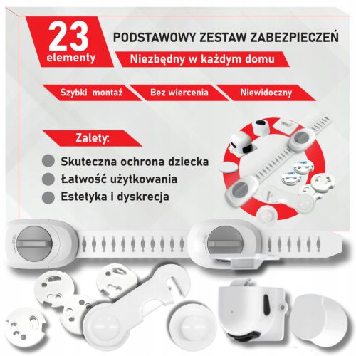 Zestaw zawiera różnorodne produkty, takie jak zabezpieczenia do szafek, AGD, gniazdek, a także blokady drzwi. Dzięki temu zabezpieczysz niemowlęta i małe dzieci przed potencjalnymi zagrożeniami w domu.