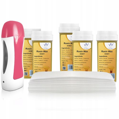 W zestawie: podgrzewacz z przewodem zasilającym, instrukcją obsługi, opakowanie 100 sztuk ciętych pasków do depilacji oraz 5 sztuk 100ml wosków miodowych z szeroką rolką.