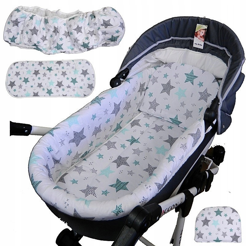 Materacyk obszyty jest biała lamówką i posiada przeszycia ułatwiające dopasowanie do dna gondoli