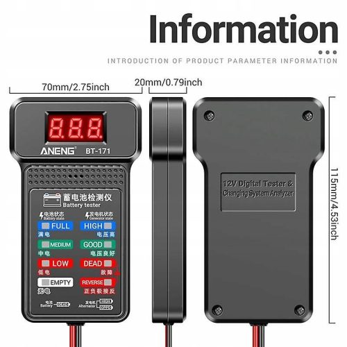 Tester akumulatorów samochodowych 12 V służy do efektywnej analizy i odczytu ważnych danych samochodu, takich jak napięcie, rezystancja wewnętrzna, prąd rozruchowy na zimno i pojemność Ah, stan akumulatora i stan naładowania. Zapewnia dokładne wyniki, oblicza zdolność rozruchową akumulatora na zimno i stopień starzenia, umożliwiając szybszą, bardziej precyzyjną naprawę samochodu. Materiał: Plastik Kolor: czarny Zawartość opakowania: 1 x tester akumulatorów Tylko powyższa zawartość opakowania, inne produkty nie są dołączone. Uwaga: Odbicie światła i różne wyświetlacze mogą powodować, że kolor przedmiotu na zdjęciu będzie się nieco różnić od rzeczywistego. Dopuszczalny błąd pomiaru wynosi +/- 1-3 cm.