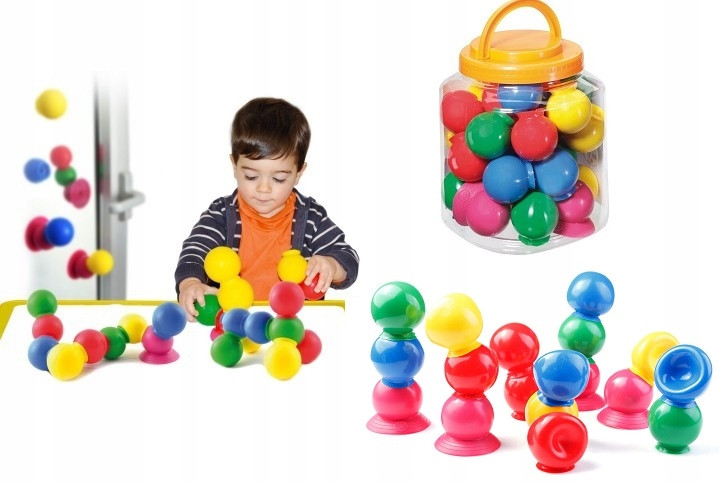 Kolorowe piłeczki, dzięki którym dziecko zaangażuje się w zabawę, a jednocześni poprawi zdolności manualne. Piłki wyposażone są w specjalne przyssawki, które po delikatnym ściśnięciu łączą się ze sobą tworząc w ten sposób różnego rodzaju kształty. Produkt spełnia wymagania norm unijnych, co zostało potwierdzone certyfikatem.